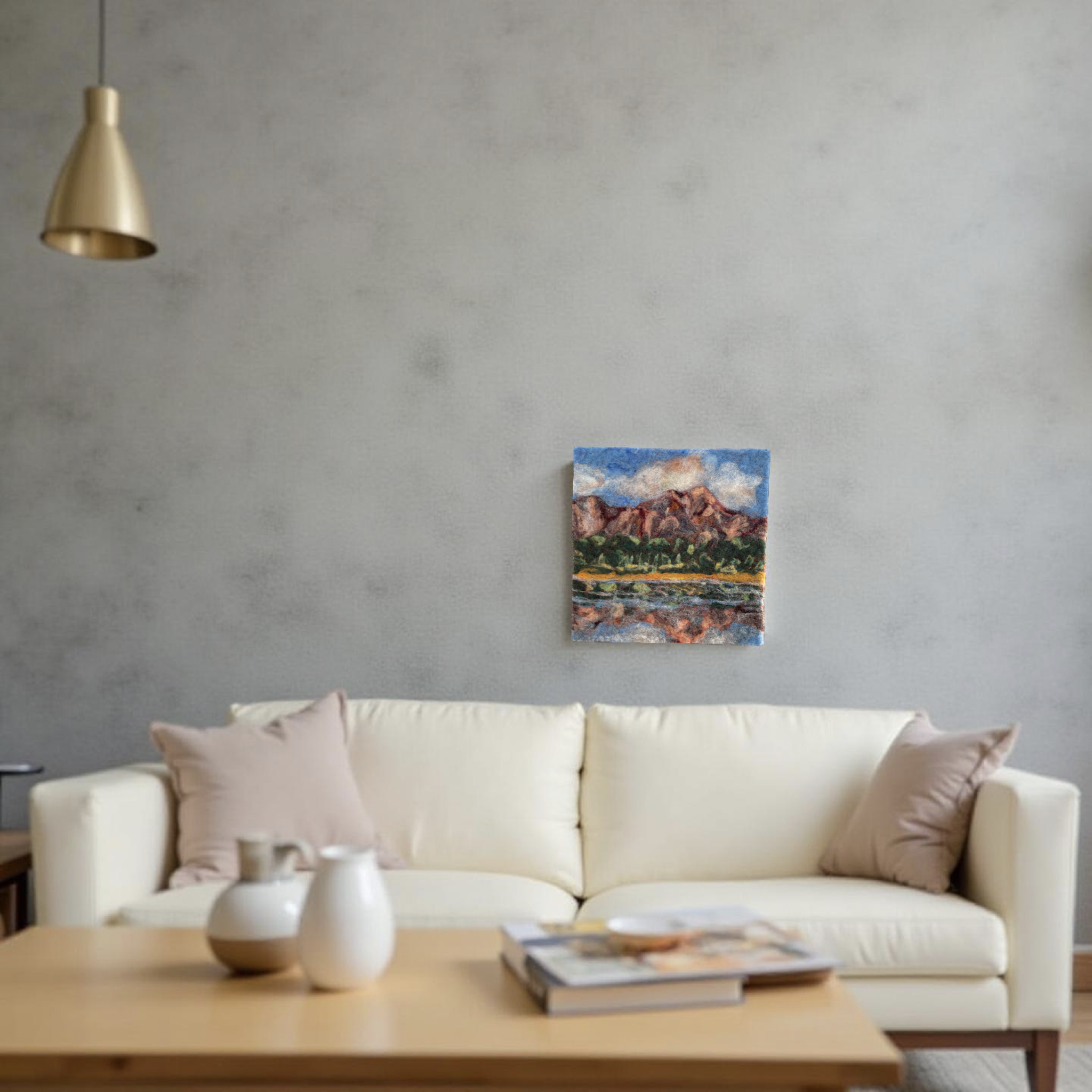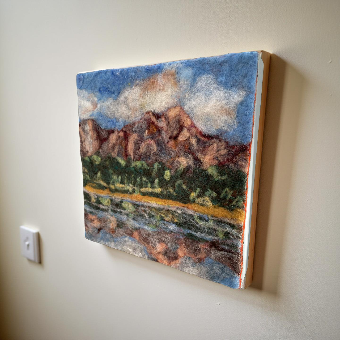 Created en plein air at Patricia Lake, looking toward Pyramid Mountain in Jasper National Park, this richly layered needle-felted piece captures the quiet grandeur of the Rockies in wool. I used soft, natural wool fibers to depict the iconic mountain’s warm rose-colored stone, a lush green tree line, and the mirrored stillness of the lake below—all under a sky brushed with gentle clouds.